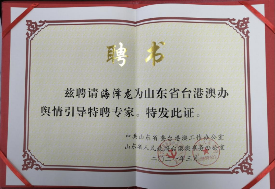 为更好地贯彻执行中央和山东省委省政府对台决策、推进两岸和鲁台各界民众之间的交流交往、为两岸关系和平发展营造积极的社会舆情环境,近日,中共山东省委台港澳工作办公室、山东省人民政府台港澳事务办公室聘请五位优秀专家学者为“山东省台港澳办舆情引导特聘专家”,我校海泽龙博士获聘。