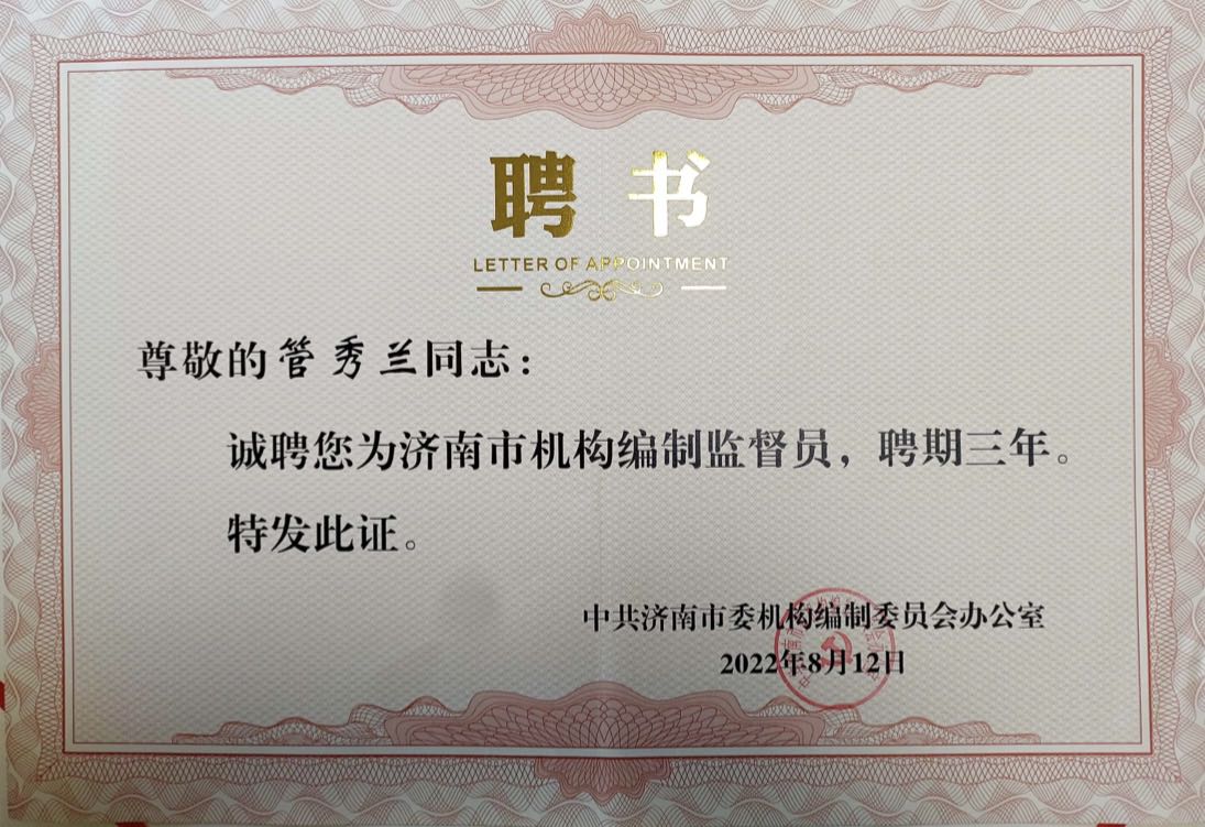 日前,济南市委编办召开机构编制监督员换届工作会议,我校党外知识分子联谊会会长、市人大代表、外国语学院管秀兰教授被聘任为济南市机构编制监督员。
