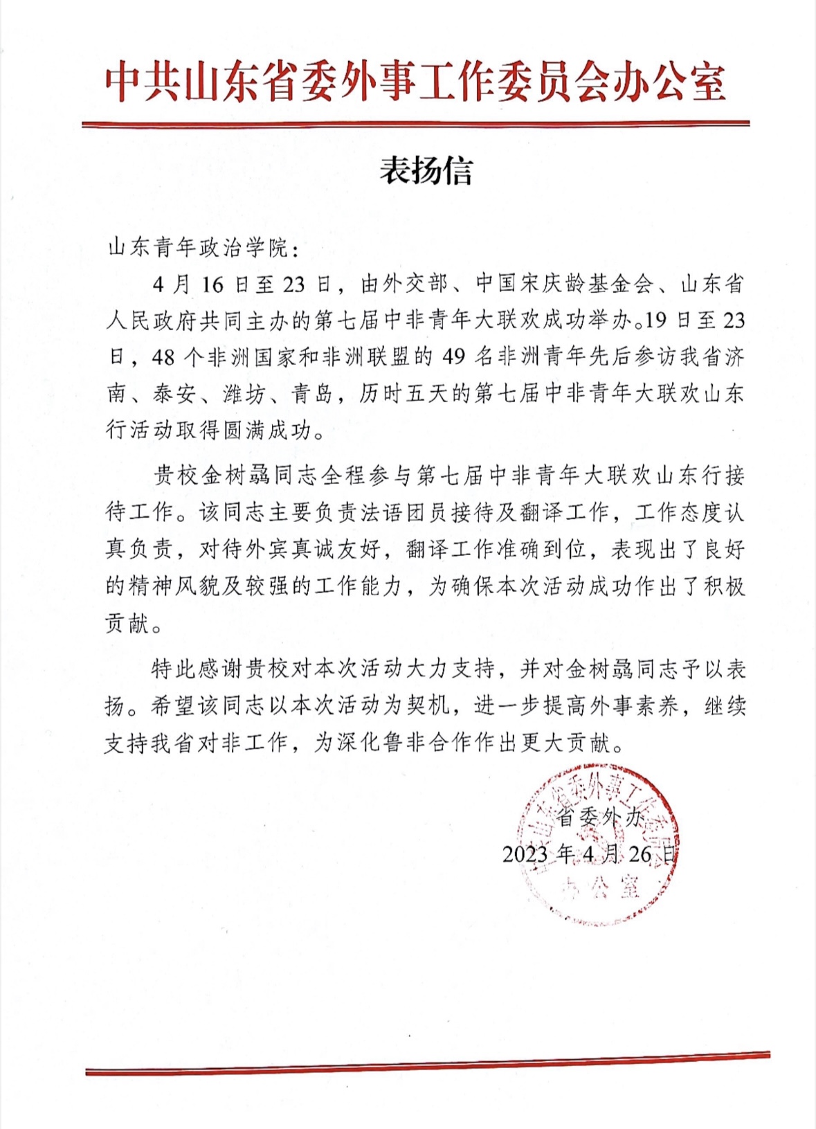 欧美同学会会员积极投身各项外事工作,在服务地方高质量发展方面也做出了积极贡献。近日,学校收到中共山东省委外事工作委员会的表扬信,对会员外国语学院西班牙语专业教师訾月琳、赵舒仪、潘昭蓉在外事活动中所作出的工作给予了高度评价。此外,会员外国语学院法语教师金树骉,积极参与山东省人民政府外事办公室主办的“凝聚青春梦想,奋进中非合作新征程”第七届中非青年大联欢活动,在翻译、协调与服务等工作中贡献了自己的力量。校欧美同学会通过积极拓展国际交流合作渠道,助力会员参与国际交流活动,扩大了学校的国际影响力。